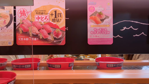 Read more①受付は機械で。ネットからの予約可。呼ばれたらレシートのQRコードを読取り、印刷されたレシートの席へ移動。②タッチパネルで注文。お寿司も回っているので取って食べることも可能。③タッチパネルで注文した商品が来ると(注文商品と書かれた台に乗ってる)、間もなく〜と案内音声が鳴り出す。タッチパネル画面に来る商品画像も表示される。流れてきたら自分の注文商品を取る。※他の人の商品と混ざって流れてくると、取り忘れ(どれか分からない為)や他のお客に取られて無くなっていたり、注文商品が続いて流れてきたりで分かりにくい!!他の客が注文商品触って戻していたり。かなり分かりにくく、システム的に間違いやすい状況。④支払いは店員を呼んで皿を数えて貰い、支払い用のカードを貰って自動精算機で支払い。現金意外にクレジットカードやpay関係でも支払える。※店員の数え間違いもあるので注意。シャリ小さめ、サーモンは劇的に生臭く不味い。ネタの切り方がバラバラ。厚みも無く小さかった。お茶も美味しくない。トリトン、魚べいの方が美味しい。あとは普通の味。デザート種類多め...