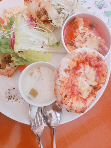 プレートの上は豪華🎶 色々なものが試せて良かったです。かなりお腹いっぱいになる😆 どれも優しい味付けで野菜にかけるハーブ塩もGood✨ ミニピザも乗ってくるのですが、こちらは種類を選べません。 ケーキもお店で作ってるそうです。どれにするかめっちゃ悩みます😆