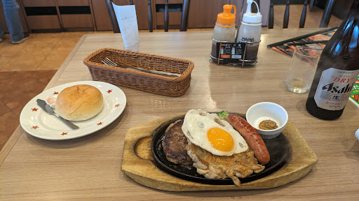 It's a family restaurant specializing in steak and "hamburg steak" served on a super hot skillet/plate, with the grease popping all over the table. Thankfully, they give you a big bib to protect your clothes. The food is good but not special. I had a steak and hamburg. A little heavy, oily for my taste. Of course, you can order something more healthy than I did. I did notice that the floor seemed kinda slick from all the oil. I live near here so I'm sure...