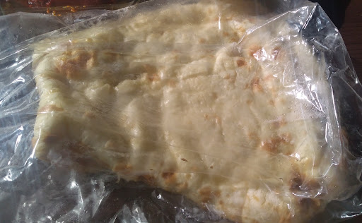 ナンは今までで一番大きいお店かも。 写真は半分に折り畳まれていますが、全長は35~40cmあります。 生地は厚め。 持ち帰りで汗をかいていることもあってしっとりモチモチタイプ。 何より甘いです。 ナンに甘みがあるから、カレーは結構辛くていいかも。