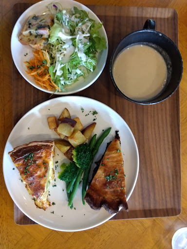 Read more平日の11時過ぎにうかがいました。 パイ二種のランチに飲み物とデザートを注文。デザートはランチを頼むと300円でつけられ、ブラウニーやチーズケーキ等4種類ありました。 5分ちょっとで届いたランチは、可愛いお店の外見から想像するより、量がしっかりありました。 まずポタージュ。手作り感あるものでなんの野菜だろ?と思っている間になくなってしまい、もう少し食べたくなりました。 次にサラダ。生野菜にドレシングのものに人参ラペもついていて美味しくいただきました。 パイやキッシュは8種類ほどから選べ、選んだビーブシチューのパイは濃厚!パイ生地は薄め。パクパク食べられました。もう1つ選んだエビとドライトマト、チーズのキッシュは、チーズが伸びる伸びる。サラダやポタージュを先に食べたせいか熱々ではなかったのですが、美味しくいただきました。 コーヒーとともに届いた食後のデザートは、チョコブラウニーを頼んだのですが、これはランチとは逆に想像より薄く残念。ランチがしっかりしていたので良い量なのかな?ブラウニーはしっとりというよりザクザク。少しボロボロしました。味は超濃厚チョコ。上に乗っていたアイスが染みてくると食感も味もちょうどいい具合になりました。 合計1920円。 また機会があれば違うパイやキッシュを食べてみたいと思い...