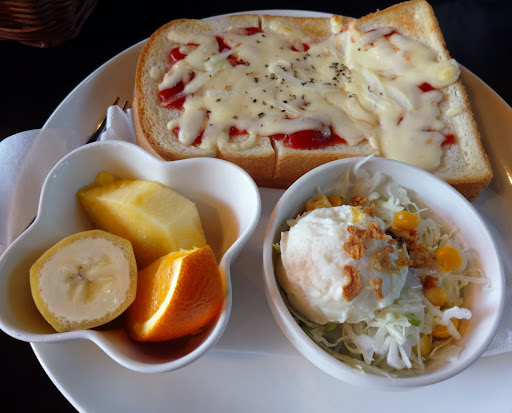 何年かぶりに嫁さんと喫茶店モーニング。 いつも通っている道ですが通りから50メートル程入っただけで全く知らなかったこの店。 駐車場も広くペット連れにはテラス席も用意されています。 課金なしのサービスモーニングから250円課金したスペシャルモーニングも数種類あり、サービスモーニングに足りなかったら課金したらパン追加等トッピング出来るのも魅力でさらにテイクアウトモーニングもあるよう(笑)。 私はホットコーヒー(税込450円)にスペシャルモーニングの「ピザモーニング」(税込250円)、嫁さんはカフェオレ(税込480円)に課金なしのBモーニングのフルーツをサラダ変更のサービスモーニングを注文しメニューを待ちます。 今日は風もなくきれいに晴れてテラス席でも良かったかも⁉️ 5分程でメニューは配膳されました。 ピザはサラミも入ってないですが玉ねぎ、チーズのピザトースト。 こんなモーニングも2年位食べてません。 サラダにはポテトサラダもついていてフルーツもまずまずで、飲み物もついて税込計650円ならいい。 サービスモーニングもパン半切れで飲み物代だけなら500円でおつりが来るこの付近のサービスは全国の憧れ的な存在らしいですね。 ただここのコーヒーだけが美味しくなくて‥。 香りも味もいまひとつなのが‥。 もう少しコーヒーが美味しければ雰囲気も...