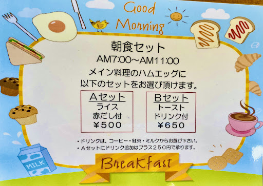 ◆朝食セットB¥650 【ハムエッグにトーストとドリンクのセット】 ワンプレート🍽にハムエッグ•サラダ🥗•サラダスパゲティ•トースト🍞+ワンドリンク☕️