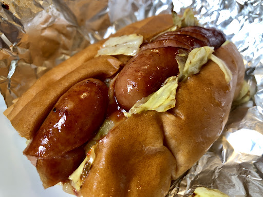 半分に切ってあるアルミホイルをそっと開いてみると、美味しそうなホットドッグが顔を出します。 きちんとソテーされたキャベツにウインナー。 ケチャップソースのような味付け。何もかもが嬉しい懐かしのホットドッグ。とても美味しいです。