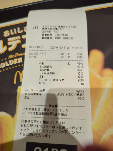ポテトの品質のばらつきが大きく、塩のキツイときは子供も辛くて残すことがある。黒焦げになったものがあったりひどい。ナゲットの中身が若干赤みがある時は本当に子供が食べても大丈夫なのか?と疑問を...