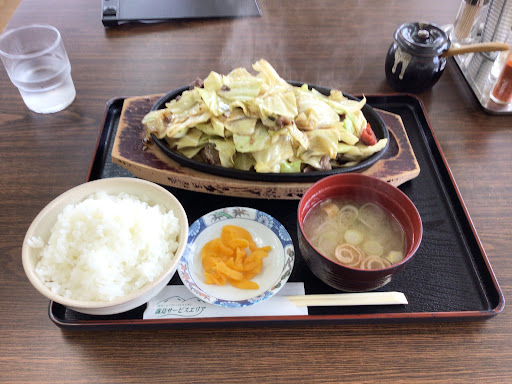 ランチで伺いました。メニューを見ると霧島スタミナ定食なるものがあります・・・ これは!福岡市民の自分には馴染み深い福岡のB級グルメ、びっくり亭(鉄板王やアイアンマン等もあります)の鉄板焼きではないですか!いつもは焼酎のアテでつまんでいるのですが、今回はご飯のお供で「スタミナ定食の大盛、豚ハラミ」を注文しました。 暫し待つ事、ジュージューと音を立てて見るからに熱そうな鉄板焼きの登場です!女性店員の方が食べ方を説明してくれました。福岡市民なら大概の方が知っているかもですが、ここは宮崎の霧島、知らない人も当然多いでしょう。辛味噌を油で溶かして、先ずは一口・・・ うーん、なかなかに美味い!ラードたっぷりで炒められたキャベツに辛味噌が絡んで、これはご飯が進むくんです。(〃艸〃)ムフッ 豚ハラミも上手い。 メニューには鶏バージョンも有ったので、それも気になりました。鉄板熱々なので、最後までとても美味しく食べられましたよ。いやー、スタミナ鉄板は焼酎にご飯にと万能ですね!最後はカプサイシン効果で汗だくになりましたが、途中何度もお冷を注いでくれた女性店員さんは素敵だなと思いました。 次回は鶏バージョンを食べてみたいと思います。 ご馳走様で...
