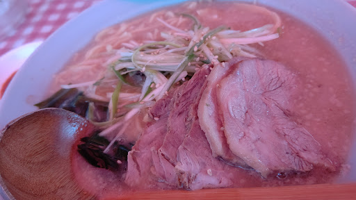 神戸ラーメンといえば神戸ラーメンの一種なんですが、神戸でも他にはないラーメンで、すごく美味しいです。175をちょっと西に入った目立たない場所にあるのですが、それでもかなり人気があるようで、平日木曜日の開店直後に行っても、駐車場(6台くらい)もカウンター(10人くらい)も半分くらいは埋まっていて、私の入店直後にすぐ満員になりました。 麺は加水麺と言うのでしょうか?おじさんが丁寧にもみほぐして4玉か5玉ずつ、つきっきりで茹でています。これが結構時間がかかるようで、讃岐うどんまでは長くないですが、7、8分くらいかな? テーブルに丼を4つ並べて置いて、おじさんがパッパッパと麺をサーブして、おばさんとバイトのお兄ちゃんがセーノ!で具などをセットしてお客の席まで運んで、その間にまた4玉か5玉茹でるという、学園祭の屋台みたいな手順で作っているので、結構待たされます。でも、見てると楽しいし、茹で上がってきた麺は最近お目にかからないプリプリな食感でイタ飯屋の生パスタみたいでした。 スープには背脂チャッチャがしてあるのですが、とても円やかな何とも言えない旨味があって、午前中だというのについ、ニンニクを投入してさらに円やかにしてしまいました。焼豚が少し硬めなのは相当本気で煮込んでタレを仕込んでいるらしく、お肉にもスープにもエキスが溢れている感じです。 大盛りを頼んでいたのですが、結構沢山だけど何とか食べられるなと思っていたら、おじさんが「ちょっとこの大盛り少なかったかな?」と言いながら、次のターンで茹でた麺を丼に一杯ドンとカウンターに置いてくれました。お腹空かせて行って本当に良かったと思いましたが、嬉しかったです。 学食みたいなプラスチックの食券とか、学園祭方式の調理法^_^、いきなりビックリ替玉など、見どころ?も十分な上にラーメン自体がとても美味しいので、行ったことない人は...