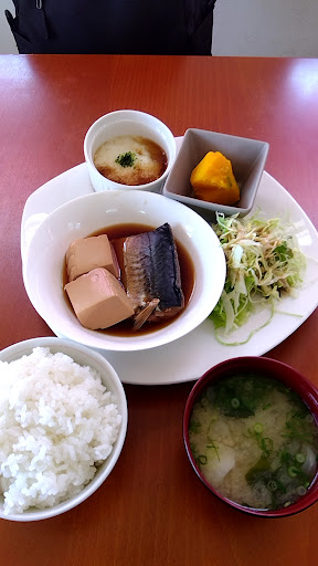 約5分後、料理が出来ました。 この日のメインは、さばの煮込み、 小鉢は山芋とろろ、かぼちゃ煮、 ごはん、味噌汁と和風な内容です。