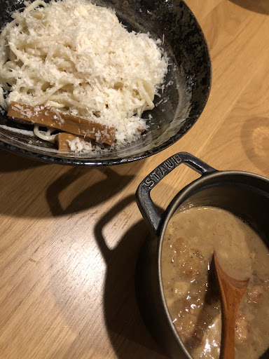 粗太麵非常好的吸附濃厚的豚骨魚介湯底,麵條的嚼勁、魚介的鮮味、豚骨的濃厚,再加上牛小腸油脂的甜美,建構出美味的四角金字塔,讓我想起年初在名古屋吃到的つけ麺汁なし専門店 "R"”(Tabelog 3.57、RamenDB 89.98) https://maps.app.goo.gl/LnsrLvTfckuHFZSg8 不過說真的,記憶中つけ麺汁なし専門店R的麵體更有嚼勁及麵香,沾湯更有層次與甘味,或許回憶總是最美的效應?不管如何,北野坂...