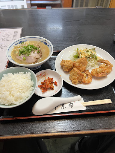 結局、海老カラも食べたくなってスペシャル定食にしました。 待ってる間にお冷と温かいお茶も出してくれます。 写真のとおり唐揚げと中くらいの海老カラが3個ずつ、半玉ラーメンにサラダもキムチも付いてます。 かなりお得感がありました。