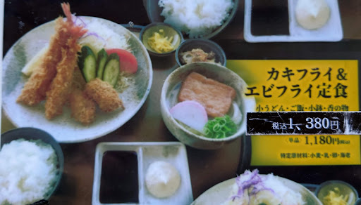 Read moreお昼ピークを過ぎた14時過ぎに訪問。ミックスフライ定食を頼んだ。うどんと味噌汁の選択ができ、時間も遅めだったので、軽い味噌汁を選択。うどんと味噌汁で価格が同じなのは、食べる人には満足かも知れないが、食べない人に取っては、何だか割損のような気がした。せめて100円位安くなれば、満足感に浸されたかと…。また、人員が不足なのか?先に利用した客が残していった食べた物が、片付けられずに放置されたままで、その横に案内され、食べ終わった食器類を見ながら、昼食を摂っていたが、気分の良いものではなかった。何カ所も放置されたままだった。最後...