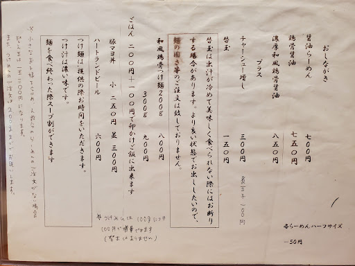初訪問のコチラ 魅力的なメニュー 価格にもびっくり。 やすっ 醤油と迷うが鶏骨醤油を