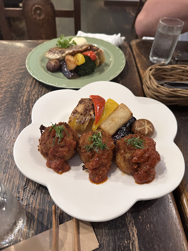駐車場はそこそこ余裕ありますので 安心していけます。埋まっていれば お店の人に聞くと教えてくれます。 お料理はランチがお得ですが 夜間のディナーはメイン料理を選び ご飯、スープ、デザートケーキ、飲み物はセット別料金となります。 ただし、ご飯、パンだけオーダーすることも可能でした。 グリル野菜が大変おいしく、ハンバーグやお魚料理など、どれも お洒落に盛り付けられほっこりする美味しさです 私は海鮮クリームコロッケとデザートの手作りのショートケーキが美味しくて大好きです。