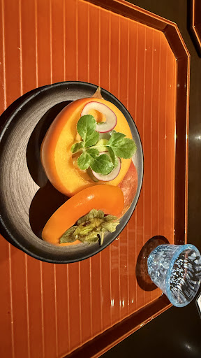 日曜日17時15分予約で両親と私達夫婦の4人で訪店 今回戴いたのは ●藤会席 22000円 ・座附 伊勢蝦レタス巻 黄身酢掛け ラレシ 防風 器として使われていたのは殆どが可食部と思われる美しく美味しそうな柿 思わず「此方の柿は器で終わってしまうのですか」と尋ねると剥いて戴くことも出来るとのことだったのでお願いしました 普通に美味しい柿だったので戴けて良かったです