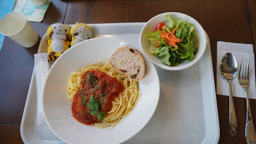 There is a café on the second floor. Mori no cafe offers a variaty of meals and desserts. I had my lunch, and it is nice. There are sitting both indoor and outdoor. Outside will be around the small pond.