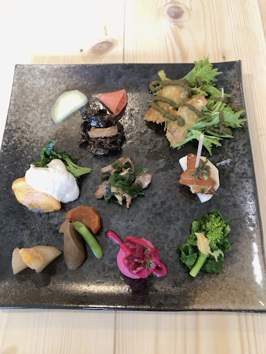 一つひとつのお料理がプレートに乗って出てきます。健康的でバランスの良いお料理をいただけます。 色とりどりで見た目も鮮やかで、加えて食材にもこだわられているとの事で、それぞれの食材のお話や、お料理が身体の何に効くかなど薬膳の知識も丁寧に教えていただきました。 プレートの他にもメインや汁物、茶碗蒸しまで付いていて大満足でした。 サラダにかかっていたカリフラワーのソースは店内で販売されているようで、美味しかったので購入して帰りました。他にも綺麗な色のソースが全5種類販売されています。