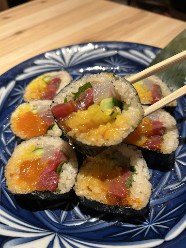 ◼︎君と鮪をだきしめたい巻き ビジュアル最高な巻き寿司は鮪と鯛にたくわん、きゅうり、紫蘇といくら、そしてポイントとなる「君=黄身」が巻かれた一品で、濃厚な卵がマグロと鯛に絡み合いそれはもう絶品!きゅうりやたくわんで食感も楽しめます。とびっこのつぶつぶ食感も良い。見た目が美しく美味しいのでコレはマストオーダー