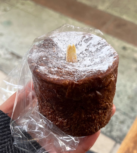 ジャンドゥージャチック・・・中にはトロットロのチョコクリームがたっぷり😋🍫 がっつりとナッツの香りがし,かな~り甘いです。甘いもの大好きな当方ですら、ややのどが痛くなる甘さ💦生地自体は柔らか~い生地で、半分に割ると生地も中のクリームもヘロンヘロンなので,1回に食べきってしまうのがいいです。上にかかっている粉砂糖は,見栄えのためでしょうが,手についてしまうので,あまり好みではないかな。。。