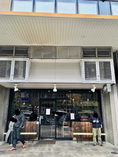 ウェルブ六甲道1階の飲食店が並ぶエリアにある「バッファローハンター六甲道店」。2号線に面した店舗の間口は大きなガラス窓で覆われているため開放感があります。一見、ダイニングバーのような落ち着いた店構えですが、店内に足を踏み入れると、肉の焼ける香ばしい匂いと肉の焼ける音に出迎えられ、一気に空腹感を刺激されます。