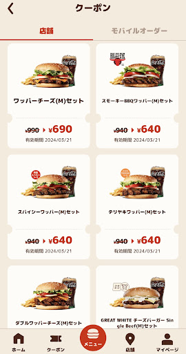 スモーキーワッパーBBQと、テリヤキワッパーと、ワッパーチーズセットを食べました。 ポテトも厚くて美味しい。半分に切ってそれぞれ包んでくれるハーフカットはとてもいい文化だと思います。 チーズ<テリヤキ<BBQの順にその日の気分かもですが美味しく感じました。 チーズは健康的なお味、テリヤキはお肉に甘辛いソースが絡んでおいしく、BBQ味は1番肉肉しくてジューシーでした。 クーポンでお得に食べられて満足でした。 グレートホワイト・チーズバーガーも食べて見たかったです。直火焼きビーフにオニオンとピクルス、まろやかな味わいのゴーダチーズを重ね、ホワイトチーズソースで仕上げた、冬チーズたっぷり。で3/21までの期間限定だったようで、食べたい時に食べておかないとまた季節...