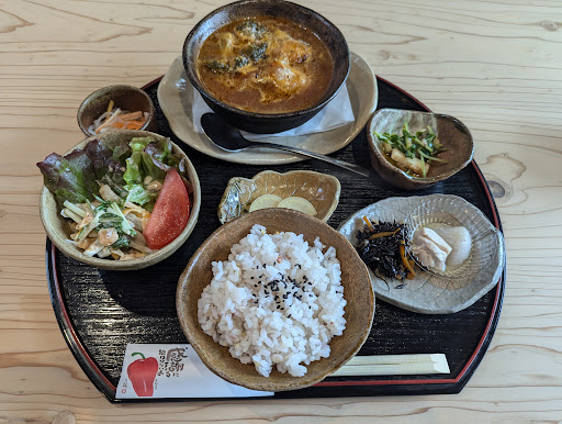 ランチを食べられるところを探していて、グーグルマップで見つけて入店。 外観、お食事できるところとは思えない(笑) 老健施設かハウスメーカーのモデルルーム(笑) 勇気を出して入ってみたら、中も一瞬、おしゃれな会社の社内っぽい(笑) 店員さんがでてきて下さり、ようやくお食事できそうだとわかりました。 ヘルシーランチ1000円にドリンク(カフェオレ半額)をつけて注文。 この日のヘルシーランチは、鶏肉のトマト煮込み。香ばしく焼かれた鳥もも肉は柔らかく、シチューっぽくて身体があったまる。 野菜も取れて本当にヘルシー。嬉しい。 ご飯も五穀米。器がどれも可愛いのも素敵。 お店のお姉さんお二人もすごく感じが良くて、店内も広く席がとってあるので居心地よい。 駐車場もあり(お店の前)。 素敵なランチタイムが過ごせました。 …この地域、どこいってもお店の方が良い人が多い。地域性かな。 ランチはヘルシーランチともう一種ありました。もう一種はボリュームある系なのかな?今度はこっちも食べてみたいです。 普段、野菜不足なサラリ...