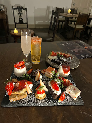 わたしは2階の広々空間のお席を利用したんやけど、照明落としたフロアにキャンドルの灯りがぽつりぽつりあって。 ヨーロッパのお屋敷にありそうな暖炉やらアンティークのインテリアがまじで異国。 飾ってあるお花は真紅の薔薇で、雰囲気が良すぎる。 映画の主人公になった気分を味わえるよ。