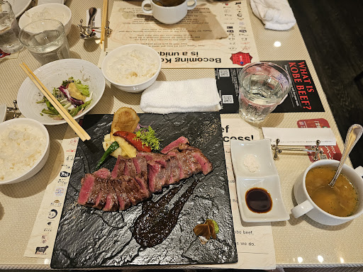 Read moreThe food here was delicious. Our server Rui was also very welcoming, friendly and nice. His explanations were very helpful and I was relived there was an english speaking staff. He also provided a size chart for the beef at this establishment. The atmosphere was extremely fantastic. They had nice warm lights and great jazzy music. I recommend getting the prime kobe one. Even the lowest prime kobe beef was super soft and tender. The sushi was also delicious. If you want the best deal come at lunch time because of their free rice, salad, and soup. It was pricy but totally worth it. You should at least try it once in your fleeting lifetime. Me and my friends enjoyed our time here and I felt really welcomed. We also all got a sticker and certificate for eating the kobe beef. Rui gave us his signature which I thought looked very classy and simple. Overall 5/5 stars would come again if I...