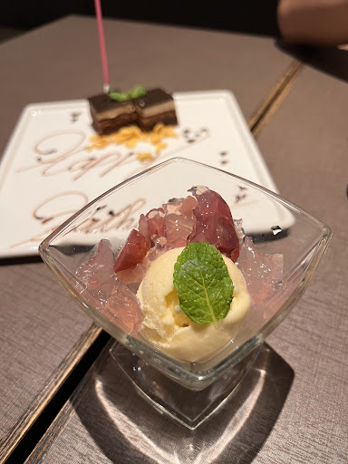 We visited during lunch hours and there are only 3 types of beef to choose from. 2 Kobe beef and another Japanese wagyu. We ended up getting the "Marbled Kobe" beef round and the "Japanese Wagyu" as the B course, which include hors d'oeuvres, soup, salad and dessert. The chef correctly assumed that we wanted to try both and offered to portion the different meats evenly and of course we accepted. We were asked how would we liked it cooked, I asked the chef how he suggests it should be prepared and he mentioned "medium" so we went with that. The hors d'oeuvres comes out first. It was beautifully plated seared tuna with pickled vegetables. The soup was next. It was mushroom based and was very balanced and subtle. After that was the salad. Honestly, it's just a plain ol' side salad. Acts as a good palate cleanser and nothing more. Then the chef brings out the beef. They let you take a picture of if before it goes on the grill. Well, it's a tease because the vegetables get grilled first. Then the beef goes on with a short "fire show". And finally you get to enjoy the beef. No one really cares about the grilled vegetables and you aren't coming here for that. Now to the beef, well, it's real Japanese wagyu alright. It certainly tastes the part. There's no mistaking the very distinct, sharp umami of real wagyu. However, these cuts of beef do not melt in your mouth. There is a chew to this cut, but it is still tender. I feel like this is very important to keep in mind if this is your first time trying the "legendary" Kobe beef. While I do prefer the A5 "melt in your mouth" version, I get flavor/texture fatigue from that and can only eat small amounts. This version is closer to extremely good regular steak texture. I did not tire of this and kind of wanted more after eating the whole thing. As far as the difference between the Kobe beef and regular wagyu go, it was very hard to tell. It was subtle and I lost track of which cut was which. Ultimately, one was ever so slightly more tender and flavorful than the other. I don't think you can go wrong with either. Dessert is served with tea or coffee at another table. We physically moved for this. And it was just ice cream......a relatively normal but clean finish to a great meal.