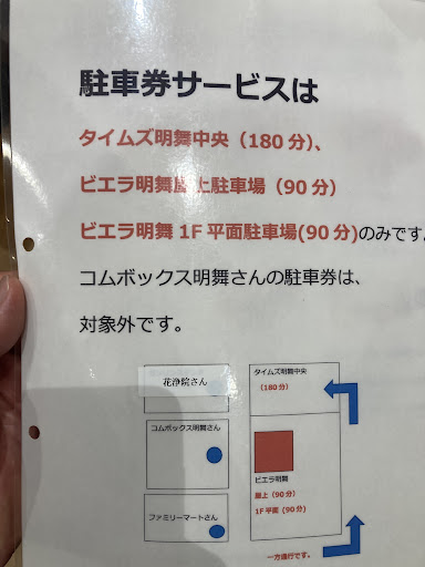 電話で駐車場の有無を確認したところ、 立体駐車場と平面駐車場があって、3時間サービス券は立体駐車場の方なので間違いないように、と丁寧に教えていただきました。