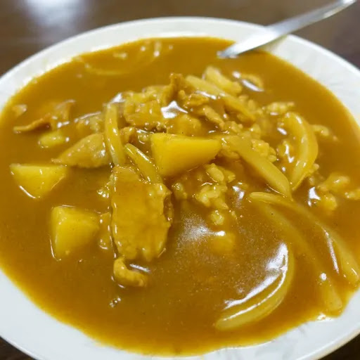 見た感じは、黄色いルーのサラッとしたカレー🍛 具材はジャガイモとタマネギ、そして豚肉のみとシンプル この具材を鶏ガラと豚骨のダブルスープで炒め、独自のカレー粉を加える そして片栗粉でとろみをつければ完成