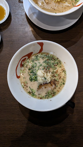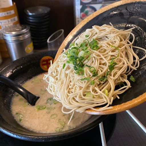 日曜の18時頃の到着。店前に他店と共同の広い駐車がありますが残り1台でした。先客は2組でかなり広いお店でしたので好きな場所に座れました。じっくりメニューを見てから口頭でオーダーです。 写真は「元味の白(とんこつラーメン)」の「特製濃口にんにく」880円税込 見た目はオーソドックスなとんこつラーメン。白いスープに柔らかそうなチャーシューが2枚と青ネギがたくさん、それと生ニンニクを1個潰したものが真ん中に載ったシンプルなラーメンです。 先ずはスープをひと口。サラッとしてクリーミーな王道のとんこつスープです。 麺はどうしたのでしょうか。麺同士がひっついて固まっています。ほぐそうにも一部はかなりしっかりひっついているので諦めてそのまま食べました。茹でるときに何か手順をミスったのでしょうか。残念です。麺そのものは角のある細ストレート麺。硬さは指定できませんでしたが弾力の強い独特の麺です。 チャーシューは5mm程と厚めですがホロホロと柔らかくて味付けもしっかり。美味しいチャーシューです。ニンニクはかなり刺激的。お子ちゃまには絶対無理なレベルですので苦手な方はご注意を。辛味好きな私はとても満足でした。 広いお店でお子ちゃま用メニューもありますのでファミリーで来ても大丈夫です。 ただ、レビューを書こうと改めてメニューを見たら写真では載ってる海苔とモヤシが入っていませんね。ニンニク追加だけで100円UPってまぁまぁ強気だなって思ってましたが載せ忘れでしょうか。...