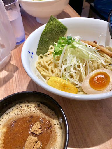 Read more以前から気になっていた三宮のみつ星製麺所に初来店。ジムの帰りに立ち寄りました。土曜日のランチ時でしたが、私の他に2組程来客がありました。店内清潔でくつろげる雰囲気です。入口横の券売機で濃厚つけ麺と生ビールをオーダー。お席で店員さんに食券を手渡すときに麺の量を伝えるシステムです。 ビールを飲みながらつけ麺の出来上がりを待つ至福の時間。 濃厚つけ麺は、麺の盛り付けが美しく食欲をそそります。付属のレモンを付けダレに投入し、中太麺をダイブ。麺は小麦の風味が感じられ美味しかったです。トッピングはかいわれ大根とチャーシュー・味玉1/2・海苔1。チャーシューはロースハムのようなタイプでした。付けダレには玉ねぎが入っていて甘味を感じられます。おろしにんにく、一味唐辛子、こしょうを投入しながら味変を楽しめます。テーブルの割りスープは昆布出汁の香るタイプでした。週末の三宮でゆったり食事が楽しめる穴場的お店です。