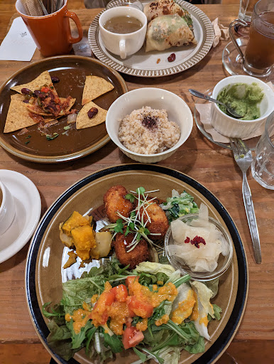 I came with my sister while we were on a day trip in Kobe. We chose this place as vegans because they offered multiple kinds of vegan proteins!! Soy meat, wheat gluten, and beans!! We got the teriyaki wheat gluten wrap, the veg set which was soy balls and a salad with rice and soup, and then the chili bean nachos without cheese.