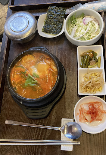 テンジャンチゲか牛スープが私の定番、どちらもスープの旨味がしっかりあってお野菜の具を先に食べたら白ごはんを投入してクッパにして食べるのがお気に入りの食し方です