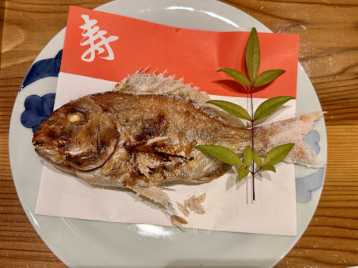 鯛の塩焼きが立派でした!包んで持ち帰ることもできると案内ありましたが、美味しくてぱくついてたらその場で大人2人食べ切りました。 (※写真の鯛は、彩りの緑の葉をズラしたあとのものです)