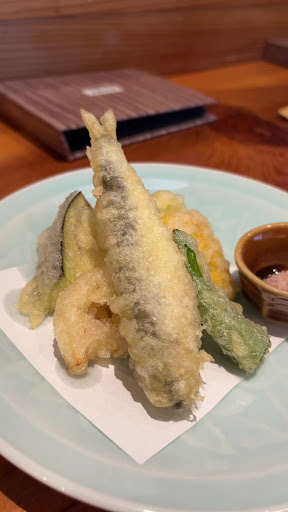 ◼︎強物 稚鮎の天ぷらと野菜の天ぷら。 薄衣でさっくりとした歯応えを楽しめる天ぷら。かぼちゃやさつまいもの甘味を堪能でき、オクラは食感が楽しめます。 そして稚鮎の立派さ!ここまで身太い稚鮎は初めてです。 身はふっくらと、肝の苦味がたまらなく美味しかったです。