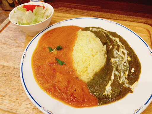 単品でもミニサラダ付き。ライスはサフランライスかな?黄色い、お米は日本米みたい。今までのより赤っぽいチャナマサラ。ひよこ豆とじゃがいもがゴロゴロ😆 始めは、おや?生姜風味だな、もう少しスパイスが効いてもいいのになぁ、ちょっと薄味かも?と思いました。それが、いただくうちにぽかぽかと染み込んでくる不思議な美味しさを求めてチャナマサラだけ食べてしまい、ライスとのバランスを見失ってしまうくらいになっていました(笑) 胃が弱っていた娘は、日替わり合いがけを「夢中でガツガツたべちゃった」くらい気持ちよく美味しくいただけたとか。