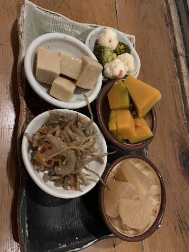 Read moreThey told us they had vegetarian food, but it seemed to just be appetisers. Even after telling our waitress we were vegetarian, (in japanese!) , and she pointed out suitable dishes on the menu (about 5), then after - she served us an egg dish with whole fish (white bait) + shrimp in it.... We ordered 2 dishes she had pointed to and it turned out to be a salad and 4 small dishes of raw cold vegetables... This with 2 soft drinks ended up being £15. 1* because the grape and ginger drinks were amazing! (ok the star rating is a bit harsh, but i want to draw attention for potentially future mislead veggies). I'm sure this place does good food if you're a meat-eater, although each individual dish is small and expensive so quickly adds up. but the staff should not tell us its vegetarian. They also tried to charge us for the egg/fish dish which was served to us without asking and we assumed was...