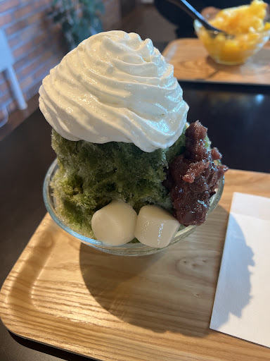 カキ氷は、抹茶を注文。 見た目はすごくいい、値段もリーズナブルな方かと思う。 ただ、他の方も言われてるように…甘すぎる! 最初、間違えて作られたのかと思いました。 (後でレビューを見て納得。)