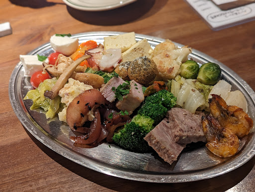 最初に前菜が一皿ドンと出てきます。7種類の前菜が盛ってあるのですが、広い平皿に小さく盛り分けられるでもなく、綺麗に仕切られた加工皿で出されるのでもなく、ドンとまとめて持ってこられるのがイタリアの家庭料理っぽくていいなと思いました。ポテトやゴーヤ、豆、キノコなど多彩でボリュームが多かったです。