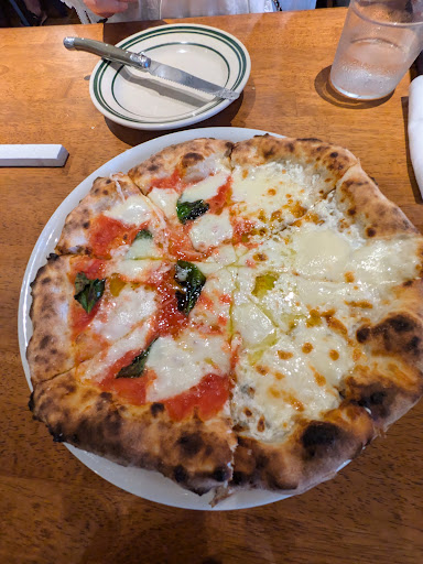 今回ピザは「フィーコ(4種チーズと白いいちじくと生ハムのピザ)」と「ナポレターナ(ニンニクとアンチョビとオレガノとフレッシュトマトのピザ)」をハーフ&ハーフにしました。生地は薄めで、縁でもちもちに膨らんだ好みのタイプ。フィーコは、4種のチーズを控えめにしていちじくと生ハムを引き立たせたバランスのよい味で、たっぷりのはちみつと相性もよくてとてもおいしかったです。チーズを楽しみたい私はクワトロにしたらどんな感じなのか気いになり、次はノーマルのクワトロを注文したくなりました。ナポレターナは王道のマルゲリータをベースにフレッシュトマトが弾けて満足感...