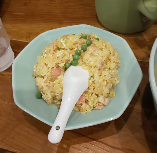 で、ミニ焼飯来ました(お新香付き) コチラもチャーシューの"コロコロ感"と良い、玉子、グリンピースの混ざり具合と良いアッという間に食べちゃいました。