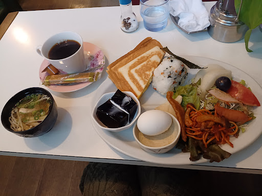 Read moreモーニング、凄いボリューム💕💕💕 卵いっぱいのホットサンド、大きめおむすび、具だくさんの味噌汁、スパゲッティナポリタン、コーヤ煮物、茹で卵、サラダ、梨、ブドウ、コーヒーゼリー、コーヒー、ウエハース、ざっと12品目、店長さんも大変感じの良いお方、お腹張り過ぎてお昼抜きとなりました。まさに再三度外の名店中の名店です😖...