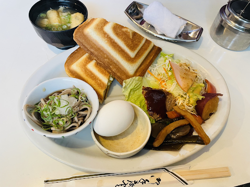 このサイトでみて一度行きたいと思ってました。今日は人間ドックで帰りにモーニングをいただきました。 おにぎり、ホットサンド、トーストどれでも550円。 お味噌汁もあつあつで具はなす、豆腐でした。 私はトーストをオーダー。サラダ、ゆでたまご、たけのことこんにゃくの煮物、なすの煮浸し、チョコレートとコーヒー。 トーストは厚切り、塗っているのはマーガリンでしたが、ボリューム満点。 味、バランスもよし、コストパフォーマンスよし。おすすめです。 帰りには両隣で、野菜...