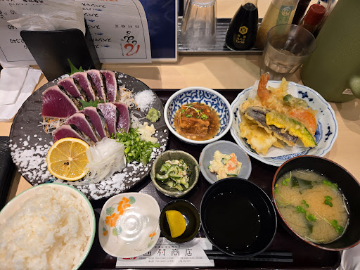Read more「西村商店 アグリコレット店」にてお昼食べました。 西村商店アグリコレット店インパクトの強い美味しいお店です。 高知旅行で高知といえば🐟️鰹のたたき🐟️知人から聞いて魚の美味しいお店「西村商店」紹介されました。訪れてのが1時頃、ゴールデンウィークなのでめちゃくちゃ混んでいました。大行列😢呼ばれたのは2時半過ぎ、ここまで混む大人気店です。 お刺身定食注文しました。残念ながら鰹のたたきは🐟️品切れ、写真のメニューを見て、タイの塩ダレ海鮮丼が美味しそうなので注文しようと思ったがそれも品切れでした。メニューのいくつかは品切れになっていました。ランチの終わる頃は品切れが有るようです。人気店なのか早めに入店するのがベストです。 お刺身定食は、ボリュームもあり鰹のアラに刺し身が盛り付けてあるのは圧巻です。SNSばえ間違いなし、御飯と味噌汁お代わり自由は嬉しい限りですね。 アグリコレット内がフードコートになっており、ゴールデンウィークの影響か?お土産店も有り、混んでいて落ち着かないのですが、西村商店内は囲いで囲まれているので、食事中は気になりません。 支払いに関してはペイペイは使えるがクレジットカードは使えません、現金です👛 また、店入口にメニューの写真もあるので迷う事もなく注文出来る、お財布と相談して料理決めました。 お客さんの事を考えて、創意工夫されたお店ですね。オーナーが考えたのか?定食一つひとつに、コメントが付け加えられいて良いですね❗ナイス👍️です。 「西村商店」高知県に旅行に来た時は是非寄りたい...