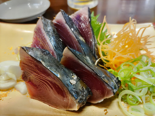 カツオのたたきは皮が厚めで炙りは控え目のタイプ。卓上に醤油や塩などがありますが、やはり塩で食べてみましたがやはりやわらかくて美味しい。ニンニクとネギを巻いて食べるとなかなかのものです。