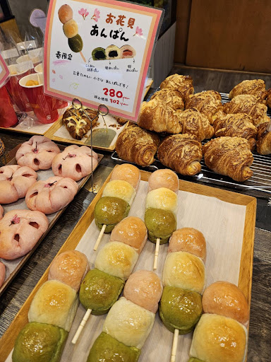 パンのいい香りが…🤭いざ入店! 清潔なトレイがあり、焼きたてのパン…迷いました! 時期に合わせたパンもあり、この日は『春』に合わせて『3色団子パン』♪