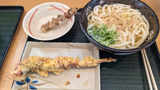 ランチでお邪魔して、かけうどん(大)とげそ天、おでんの牛すじを頂きました。連れは8種野菜のサラダうどんを頼みました。 久し振りだっので、かけうどん(大)が590円になっていて驚きました。一番よく通っていた10年前は330円だったので、ほぼ1.8倍。ちなみに10年前に105円だったうどん(小)も今は290円、2.7倍でした。まぁはっきり言って、以前が安過ぎた気がします。 ですが、そうは言っても適正な値段になると相応のサービスを求めてしまうのが人の業。カウンターの綺麗さや揚げ物の形崩れ、麺の茹で加減やお水のサーバー周辺、従業員の方の笑顔…などなど、安値が売りのお店なら納得できて気にならないようなところに、自然と目がいってしまう自分がいやらしい…。 ですが、結果として大変満足してお食事させて頂きました。お店も綺麗だったし、従業員の方のもちゃんとされていました。 味は間違いなし、です。讃岐うどん系のチェーンでは、ここが一番私好みのお出汁です。食べるとほっとします。麺もちょうどでした。ごまとしょうがは自分で足せますが、自分で足せないネギは店員さんのトングにすべてが委ねられており、今回は十分な量が載せられておりました。これらをぐるぐるっと混ぜて、お箸で麺をどばっとまとめて掴み、一気にが、が、が、がぁっと口にすすり込んでいく…。幸せです。ちなみに本場の通の方々は噛まずに喉越しを楽しむようですが、私はその域には達しておりません。 げそ天は超ビッグサイズをゲットすることができたので、ラッキーでした。いか天ではなくげそ天があることが、私にとっては大きかったです。 連れの頼んだ8種野菜のサラダうどんですが、これも大変おいしくて気持ちよかったです。麺の硬さは冷やし系くらいの方が好みです。出汁優先ならかけ、麺優先なら冷やし、と言う感じでしょうか。 味でも環境でもおいしく食べられるのなら、また通っても...