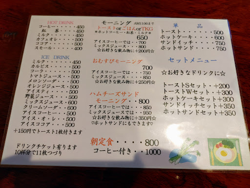 外から見た雰囲気は暗い感じがしたけど、中に入ってみると店員さんは明るくてフレンドリーでとても好印象を受けました。 モーニングの時間が過ぎていたからモーニングを頼めないなぁと残念がっていたら、「大丈夫ですよ」と言ってモーニングを提供してくれました😆 値段は少し高めかなとも思いましたが、ハムとたっぷりのチーズが入った、ふんわりサクッのホットサンドに生野菜のサラダ・マカロニサラダ・良い感じの半熟加減の目玉焼き・みそ汁・フルーツ・コーヒーとボリュームもあって美味しくて...