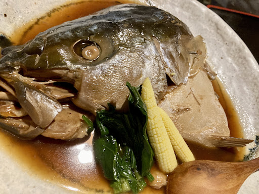 ■ブリカブトの煮付け 1,800円 写真ではわかりづらいですが、お盆と同じくらいのびっくりするくらい大きなお皿で登場。 これにお刺身もついてこの価格はお安い。
